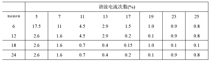 對于外部三相輸入電流,是一個方形臺階波形,可以用傅氏級數的形式分解成等效的(50Hz或 60Hz)基波分量加上各基波奇數倍次的正弦函數分量。但是考慮到晶閘管的換流、三相電壓微小的不平衡等因數,IEEE綜合理論計算和實際測量值,給出了不同整流配置情況下各次諧波電流幅值和基波電流幅值之間的數量關系。